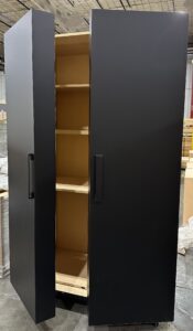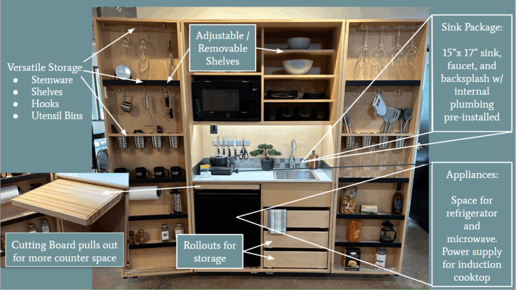 The Armoire Kitchen is a fully functional kitchen that features ample storage options, space for appliances, and ships complete with sink, faucet, countertop, and backsplash pre-installed.